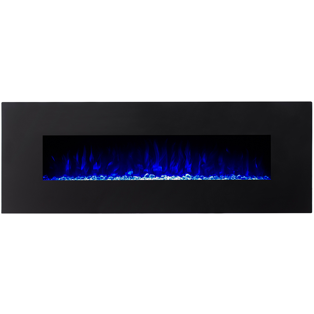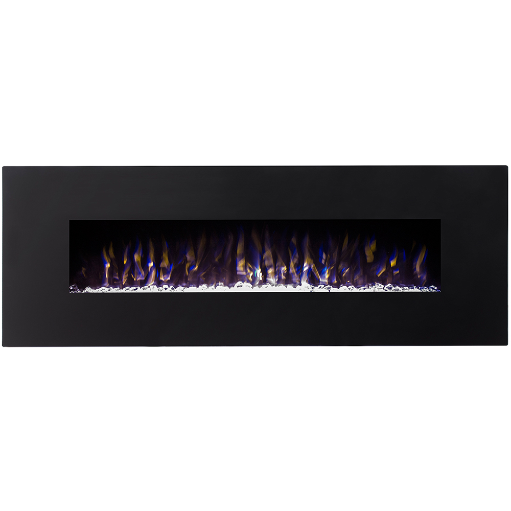 - REALISTIC FLAME: Its realistic flames are set in a pile of crystals without the need of running gas lines for gas logs, carrying firewood, smoke, ash clean up, and other duties fireplace owners are used to, that lends to authentic fireplace without the hassle. The crystal set lies behind durable tempered glossy glass with a contemporary matte black frame. Enjoy this vent free, smoke-free air while feeling warm during a cold night. This electric fireplace is 72W x 5.5D x 21.7H Inches
