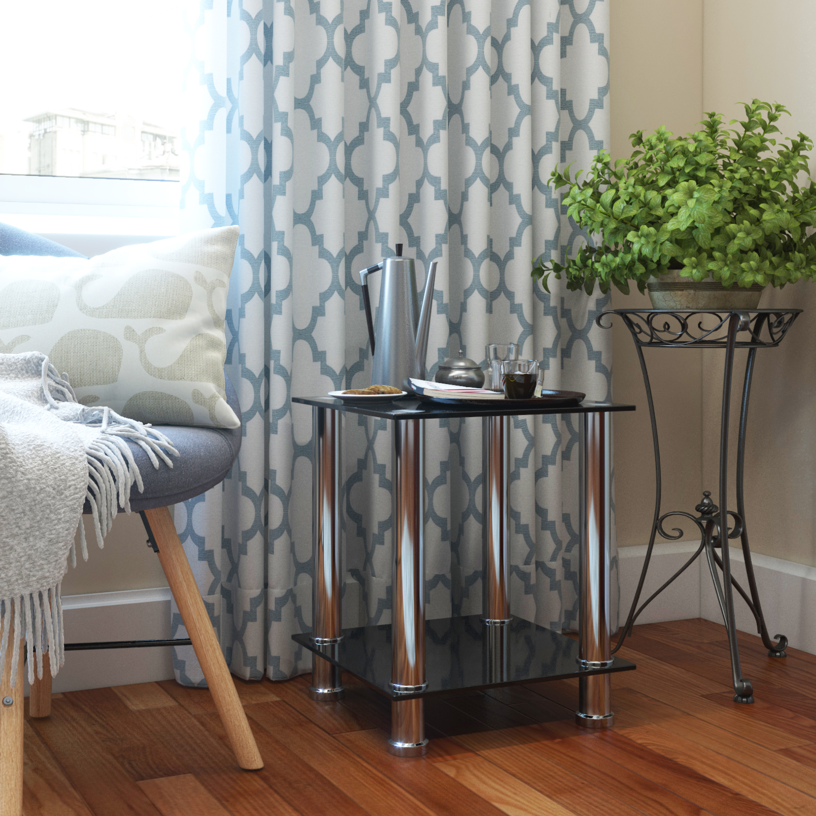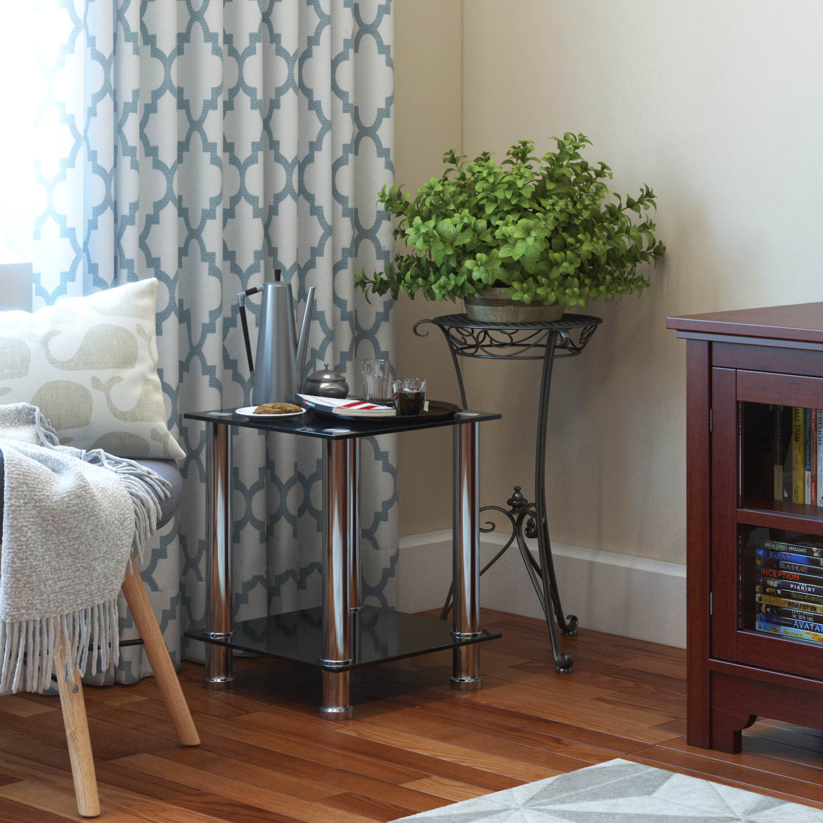 Audrey End Table Sofa Table Night Table with Tempered Glass Shelves in sleek chrome frame and black glass modern clear glass side table end table. Contemporary simple style makes it fit any decor of different rooms. 8 mm Thick tempered glass top with max weight capacity up to 33 lb. Used as phone table, end table, lamp table, side table and decorative display table. Suction cups placed at the top of stainless steel frame and the glass top placed above it.