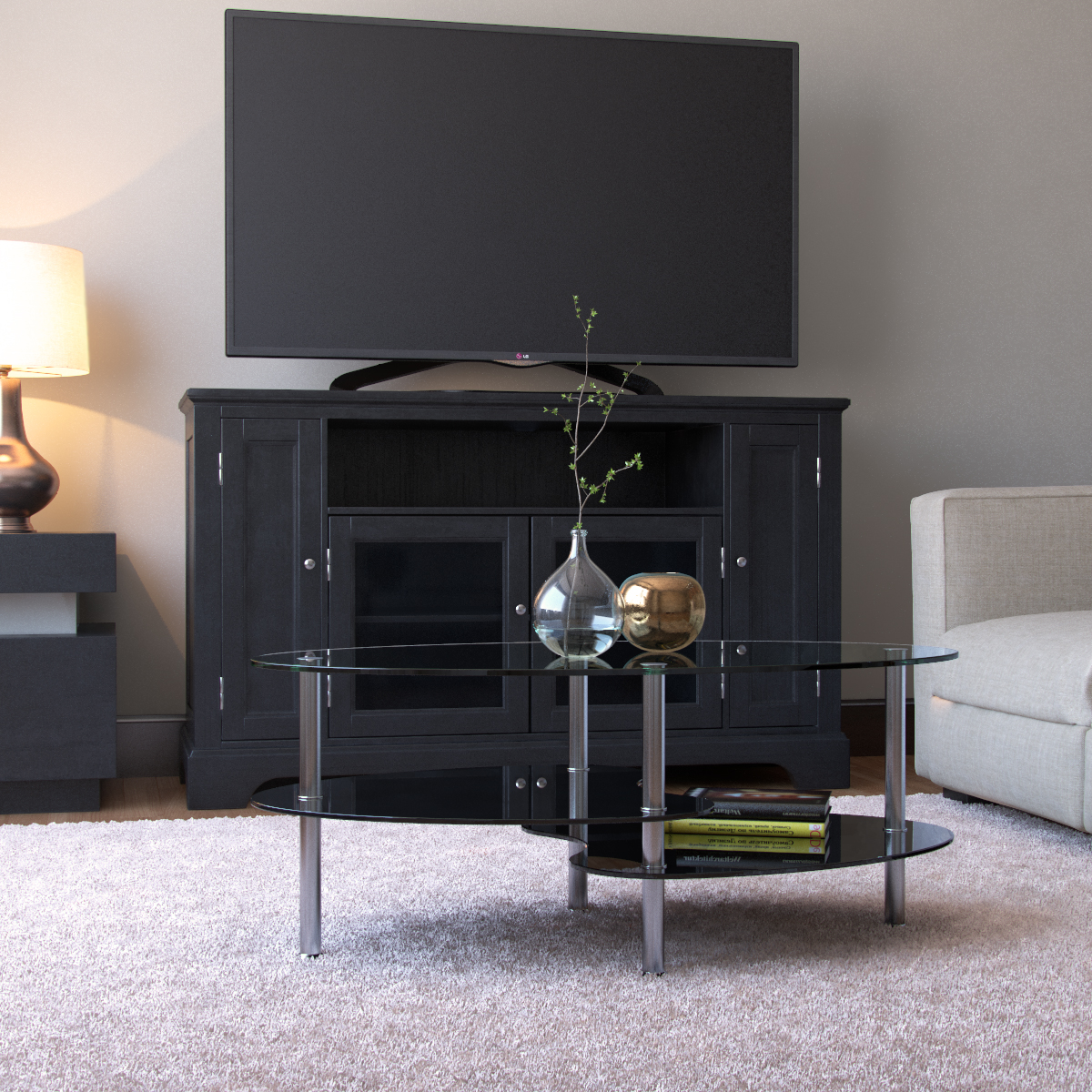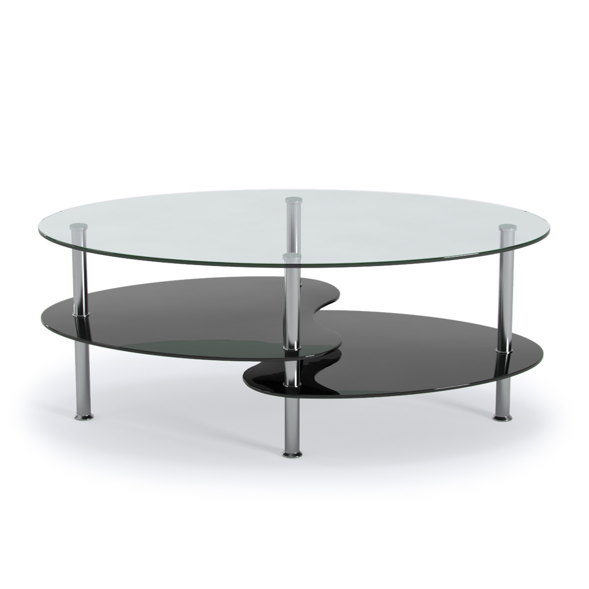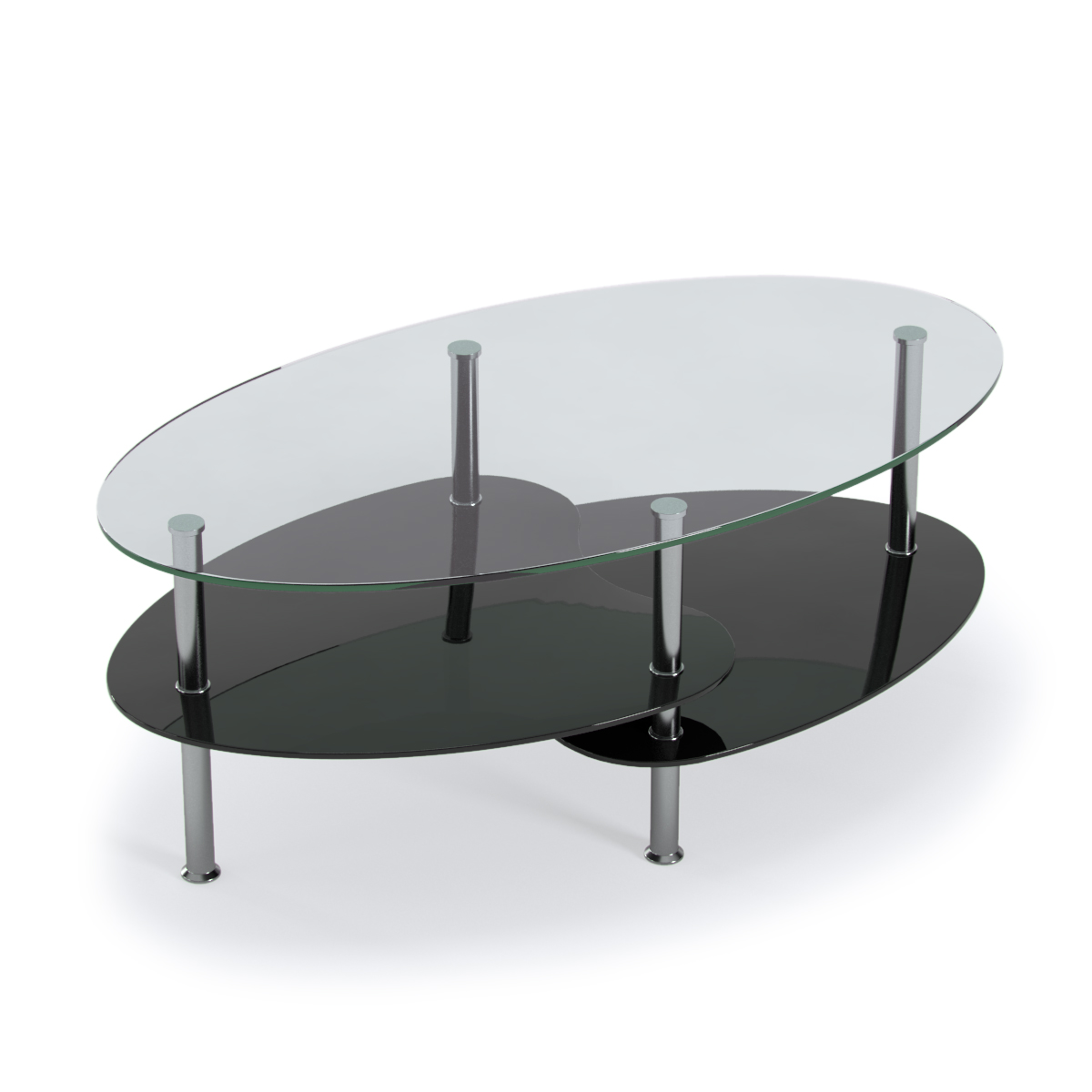 This stylish, contemporary oval two-tier black glass coffee table offers multiple levels to showcase magazines, books and more. It’s distinctive curved legs support tempered safety glass and a frosted lower shelf. Each glass shelf features beveled edges for a smooth, soft edge. Three levels of glass combined with brilliant steel legs create a stunning piece.